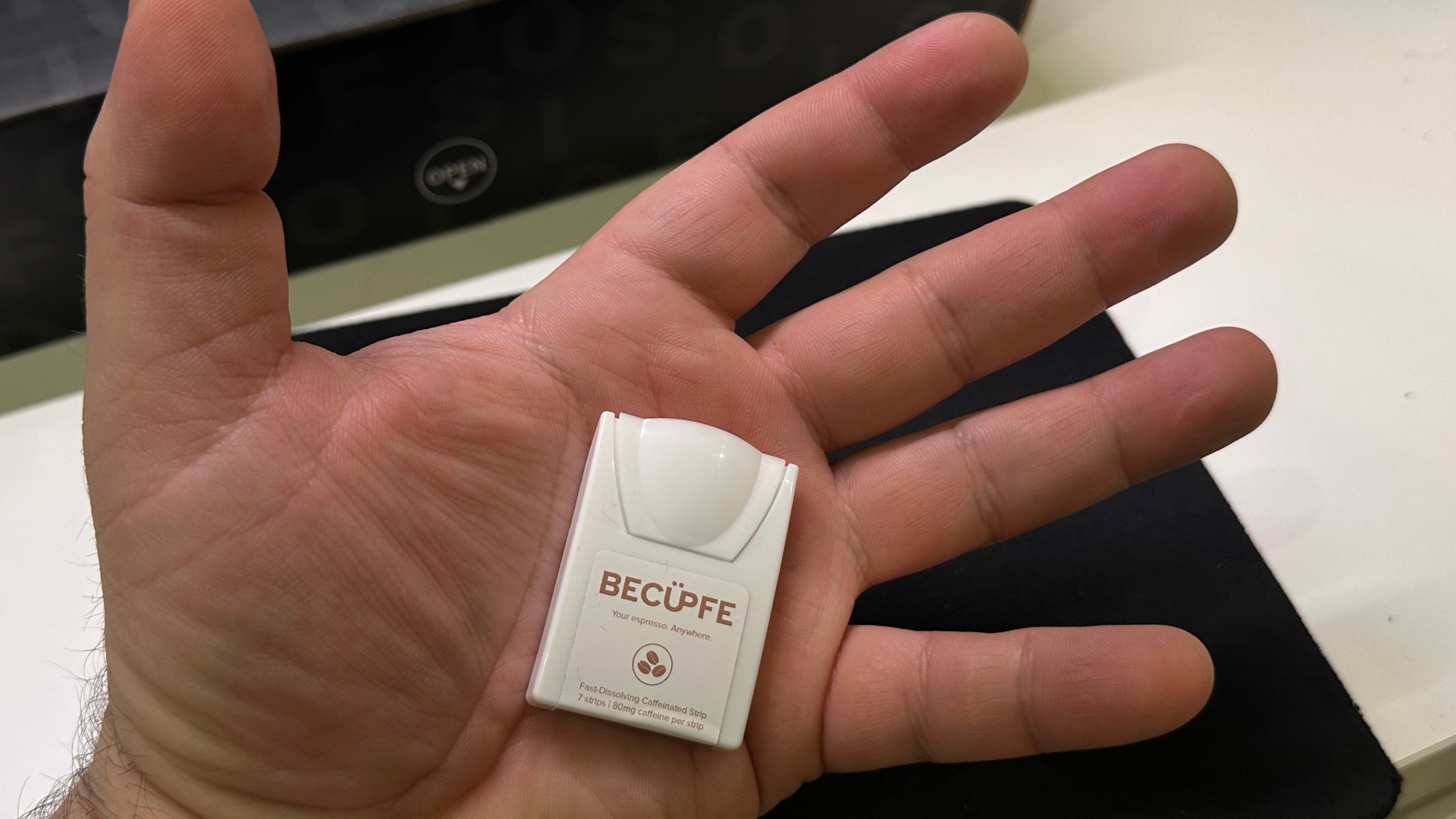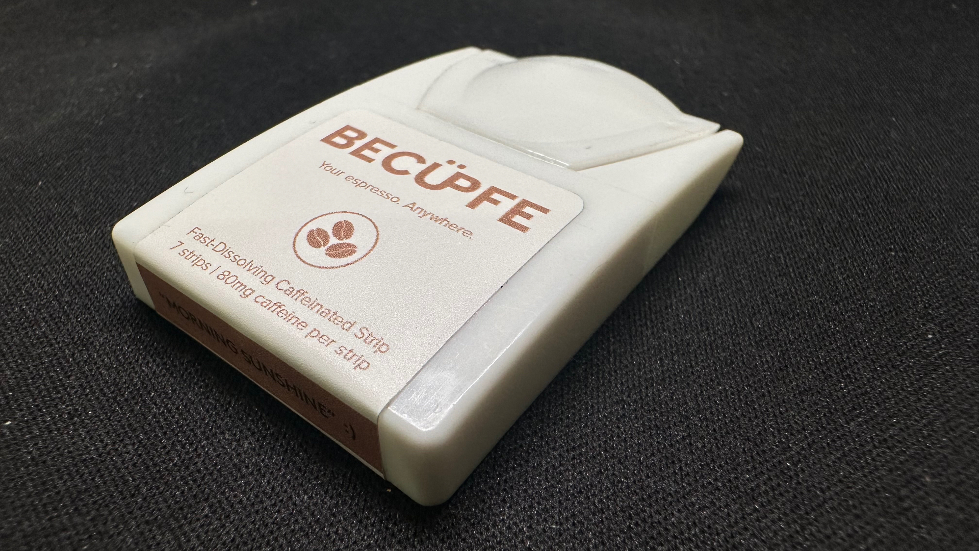 A fast-dissolving caffeinated strip. Place one on your tongue and let it melt — no water, no cup, no barista.